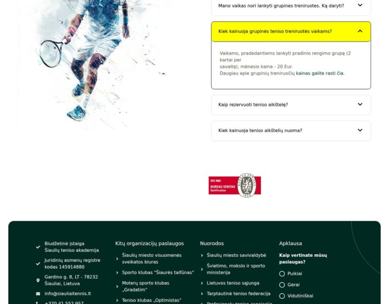 Nous avons conçu et développé un nouveau site web pour l’Académie de tennis de Šiauliai afin de présenter ses programmes, ses événements et ses activités communautaires de manière claire et accessible. La plateforme aide les joueurs, les parents et les visiteurs à trouver rapidement les informations essentielles tout en renforçant la présence en ligne de l’académie.