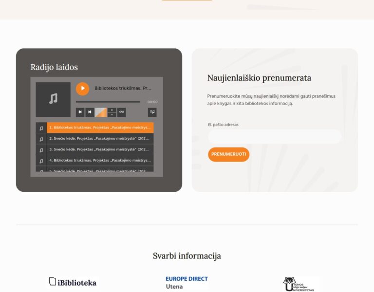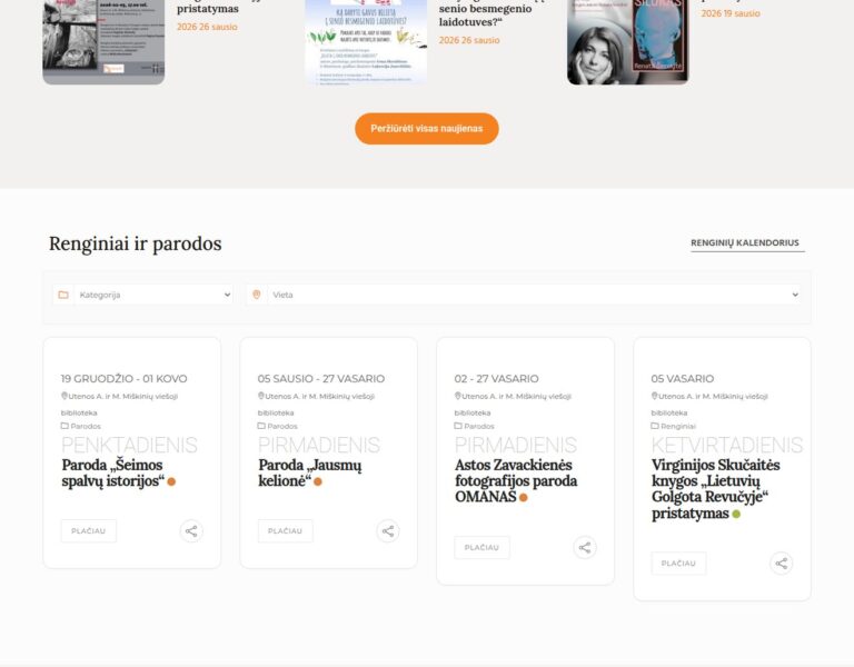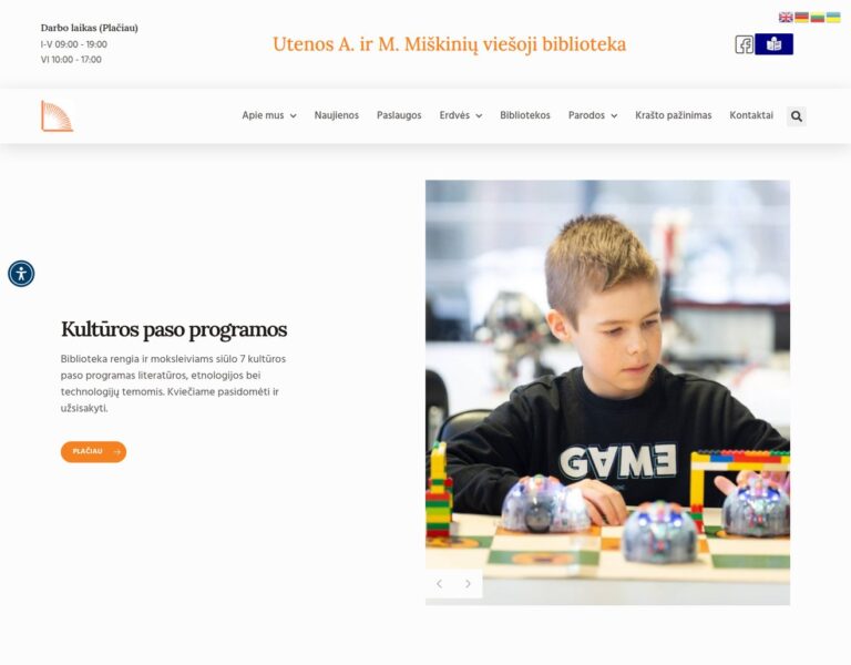 Nous avons repensé et développé un nouveau site web pour la Bibliothèque publique Utena A. et M. Miškiniai afin de présenter plus clairement en ligne ses services, ses événements et ses activités culturelles. Le résultat est une plateforme numérique plus accessible qui aide les habitants à découvrir l’offre de la bibliothèque et à rester en lien avec leur centre culturel local.
