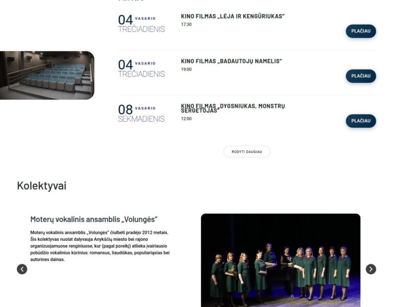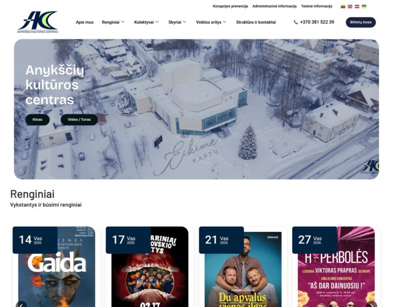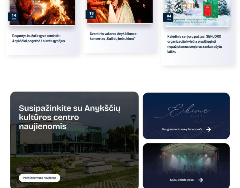 Nous avons créé un site web moderne pour le Centre culturel d’Anykščiai, qui présente ses événements, ses activités et son rôle au sein de la communauté de manière claire et accessible. La nouvelle plateforme aide les habitants à découvrir ce qui se passe localement et permet au centre de partager plus facilement son programme culturel en ligne.