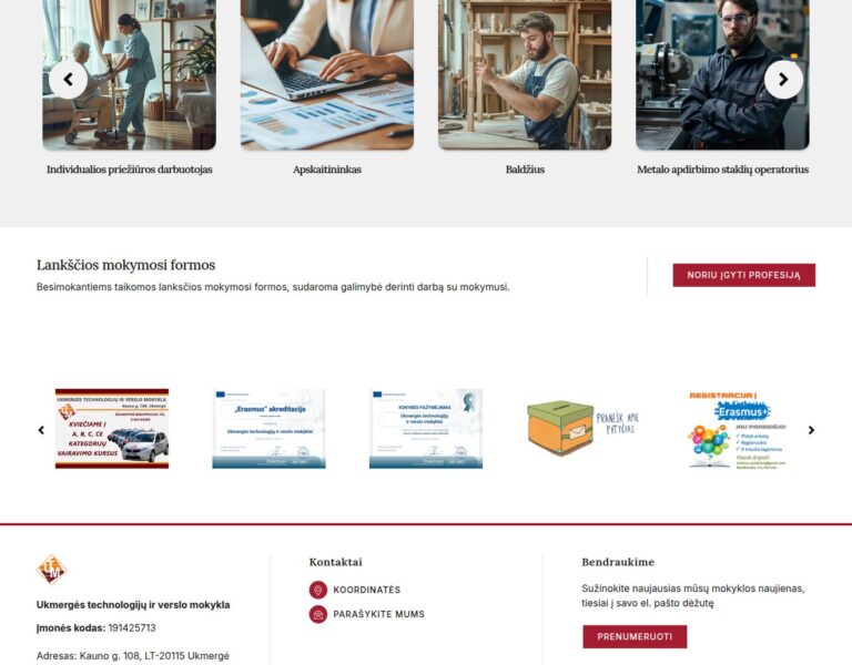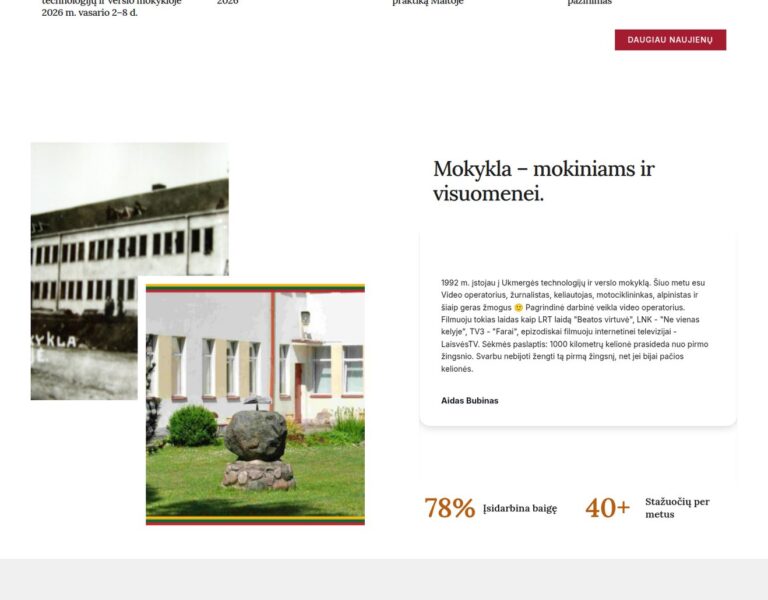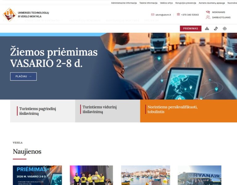 Nous avons créé un site web moderne pour l’École de technologie et de commerce d’Ukmergė, qui présente ses programmes d’études, la vie scolaire et les informations publiques de manière claire et accessible. La plateforme aide les futurs élèves, les parents et les partenaires locaux à comprendre rapidement ce que l’école propose et comment elle soutient une formation orientée vers les métiers.