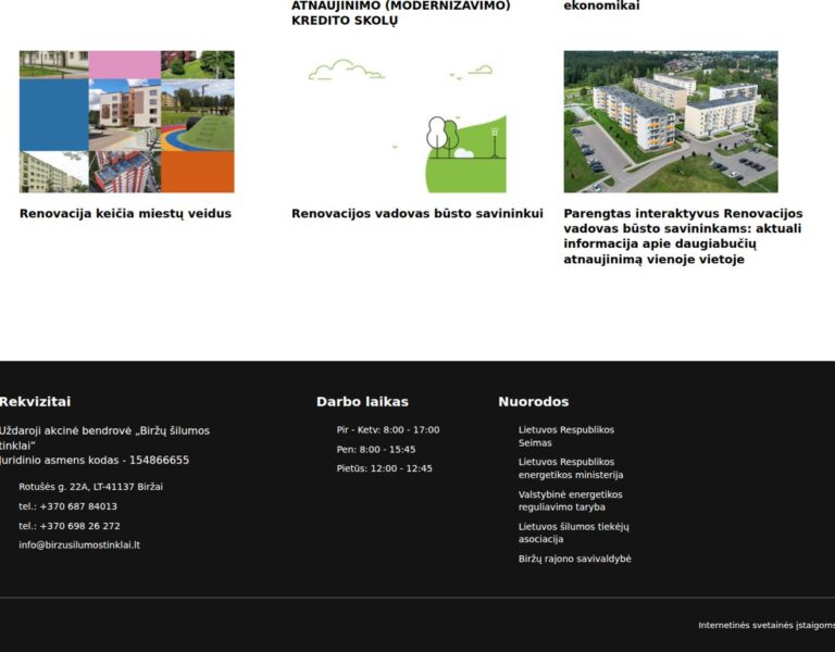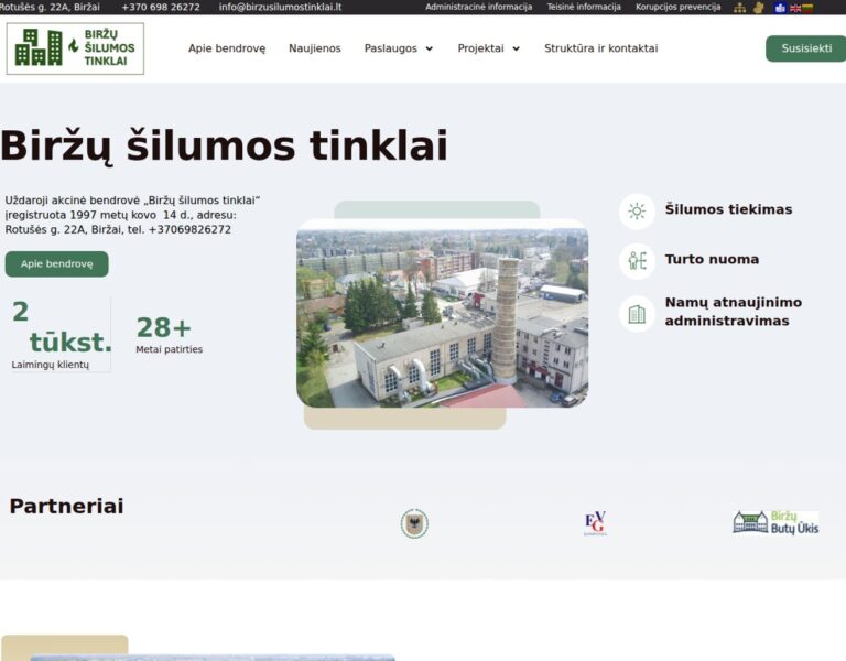 Nous avons conçu et développé un site web moderne pour le réseau de chauffage urbain de Biržai afin de rendre les informations essentielles sur les services plus faciles à trouver et à utiliser. La plateforme offre aux habitants et aux entreprises un accès simple aux actualités, aux contacts et aux informations clés sur les services publics.